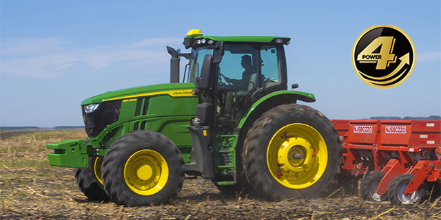 6R系列拖拉機采用約翰迪爾 PowerTechTM PSS 6068發動機。雙可變幾何尺寸渦輪增壓器、每缸四氣門的進排氣系統加高壓共軌燃油系統的配置使發動機動力表現強勁,響應速度更快。發動機的額定凈功率達到240馬力(*此額定凈功率數值詳見 GB 20891-2014),中重負荷作業效果更好。扭矩儲備達到34%,可應對更復雜的作業情況,減少換擋頻率,提升有效作業時間。后處理系統采用DOC+DPF+SCR+AOC的方案,在尿素參與下尾氣處理效果好,滿足國家排放要求。后處理系統可在不影響作業的情況下進行主動再生,需要維護的環節較少,為用戶省時省力。后處理系統經過全球市場的多年實踐,穩定可靠,讓用戶更安心。