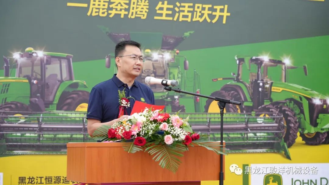 黑龍江恒源迪農業發展有限公司總經理杜立志發表了開場致辭(下圖)。他表示,作為迪爾授權經銷商,恒源迪農業將不負約翰迪爾公司和用戶朋友的信任與期待,砥礪前行、全心全力的將迪爾品牌的核心價值觀“誠實、優質、守信、創新”發揚光大。公司有著完備的市場推廣、售后服務、配件供應體系和經驗,相信會給用戶帶來更好的產品使用體驗,讓用戶創造更大收益,為黑龍江現代農業特別是農機現代化的發展添磚加瓦。